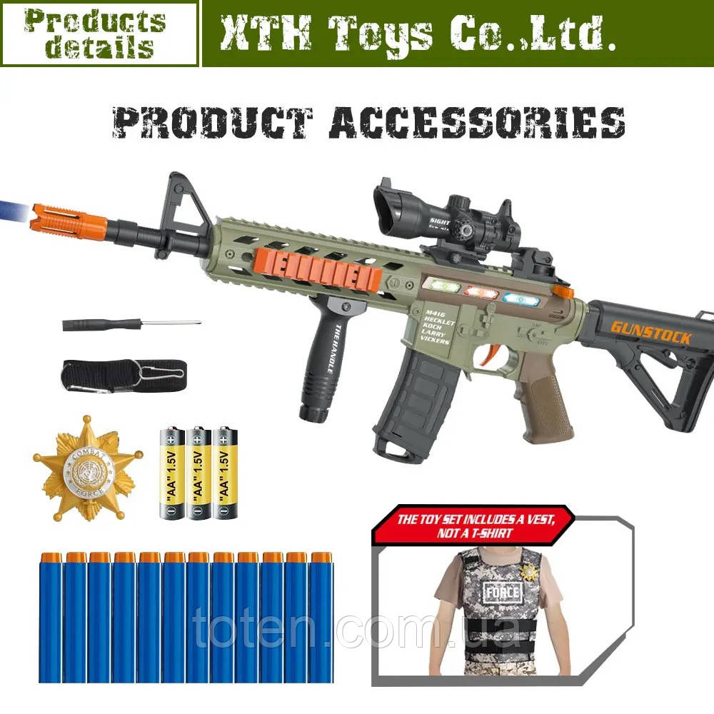 Набір військового - автомат з м'якими патронами та бронежилет арт. 35190 Відмінний набір для дитини, яка мріє стати хоробрим воїном та справжнім героєм! У комплекті реалістичний автомат (стріляє м'якими патронами) з оптичним прицілом, прикладом знімання, світловими і звуковими ефектами, патрони з присосками, жетон, бронежилет і ремінець для зручного носіння зброї. Іграшка працює від 3х батарейок АА (не входять в комплект). Розмір пакування: 44-6-25 см.